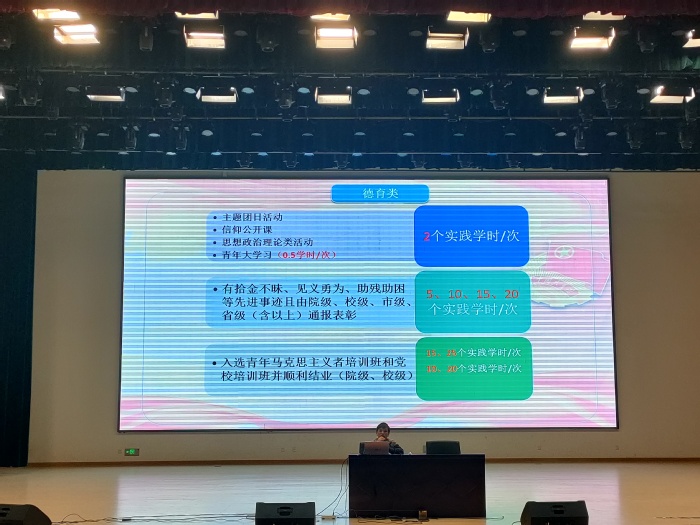 校团委时昕朦老师首先介绍了老员工艺术团的概况及招新要求。而后公司团委书记徐霞老师主讲,首先讲述第二课堂的意义、内涵、活动类型以及PU平台使用,重点解读了《韦德官方网站“第二课堂成绩单”制度实施办法》这一文件。她从德育、智育、体育、美育、德育五大模块逐条解读学时认定的规则和注意事项。