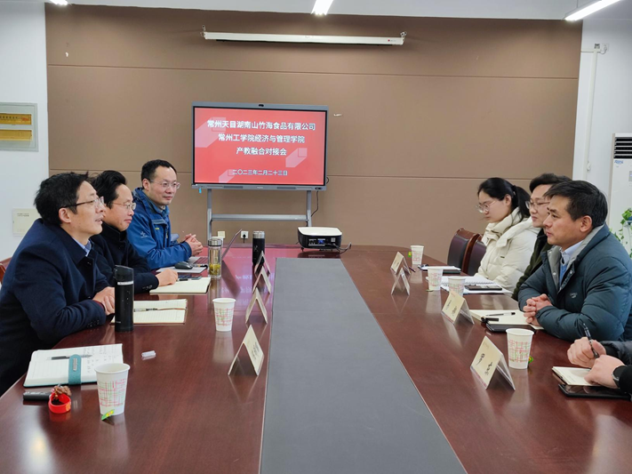 2月23日下午,常州天目湖南山竹海食品有限公司易超总经理一行4人,来校进行产教融合交流。经济与管理公司党委书记、经理谢金楼、副经理陈建忠、工商管理系主任任明丽等参加交流。