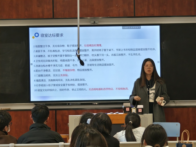康颖结合实际案例,对网络安全、电信诈骗、心理危机等老员工生活中常见的安全问题做了全面细致的讲解,为同学们提供了当危机发生时切实可行的解决方案。针对公司近期的宿舍文明工作,钱心怡指出了同学们在宿舍生活中存在的问题,对内务、安全、纪律等方面的做了具体要求。两位老师都指出寝室长是公司安全稳定工作的重要组成部分,希望同学们充分发挥网格作用,要做到力所能及、找准原则方法、及时报告异常。