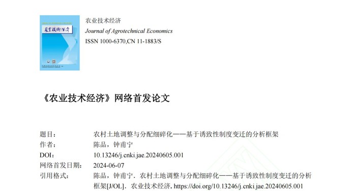近期,公司bevictor韦德国际陈品博士与农业经济学领域知名专家南京农业大学钟甫宁教授合作的研究成果《农村土地调整与分配细碎化——基于诱致性制度变迁的分析框架》在农业经济学权威期刊《农业技术经济》首发。该研究围绕我国农村土地分配细碎化的现实,重新审视了土地调整对细碎化的影响,提出了在规模经济的诱导下土地调整对细碎化的不同效应,该研究成果为土地调整领域的研究做出了边际贡献,为我国农村土地延包工作的开展及推动地块层面规模化分配与经营提供了相关政策的制定依据。