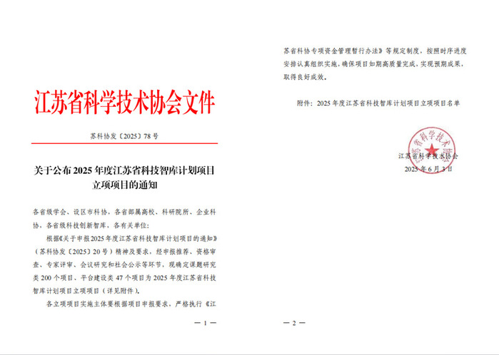 近日,2025 年度江苏省科技智库计划项目遴选结果公布,公司申报的 2025 年江苏省科技智库计划(智库)平台项目成功获批。