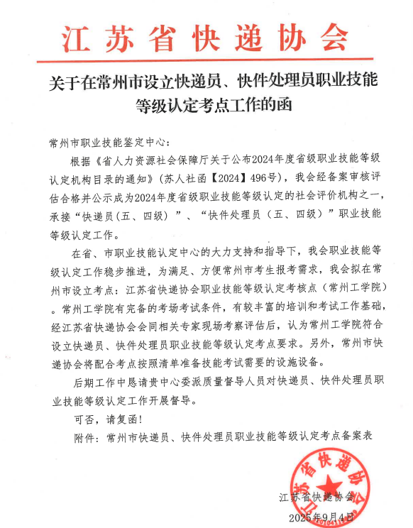 近日,常州市职业技能鉴定指导中心正式复函江苏省快递协会,同意在公司设立职业技能等级认定考核点。这一资质的获批,标志着公司正式成为江苏省物流快递行业高技能人才的重要评价基地,是公司深化产教融合、服务地方行业发展的又一举措。