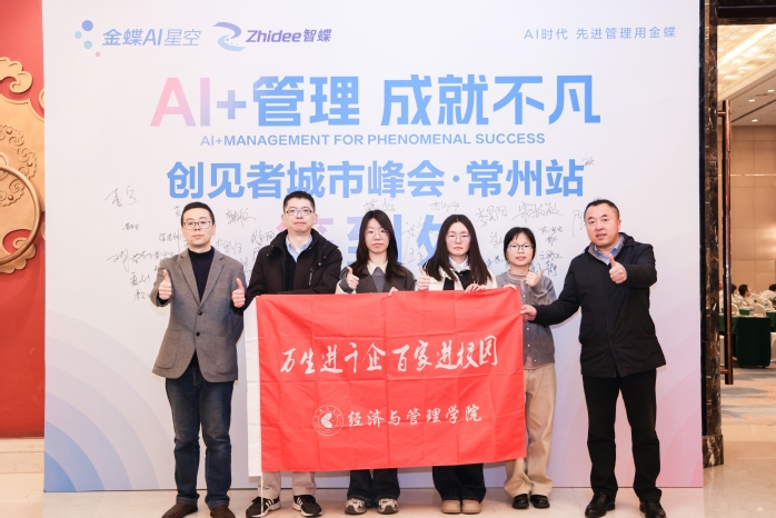 3月26日下午,bevictor韦德国际师生受邀参加由江苏智蝶数字科技有限公司和金蝶(中国)软件有限公司主办的“AI+管理 成就数智——创见者城市峰会・常州站”主题会议。财务管理系主任沈毅、就业辅导员李成作为教师代表出席,财务管理系23级与22级员工代表一同参会。